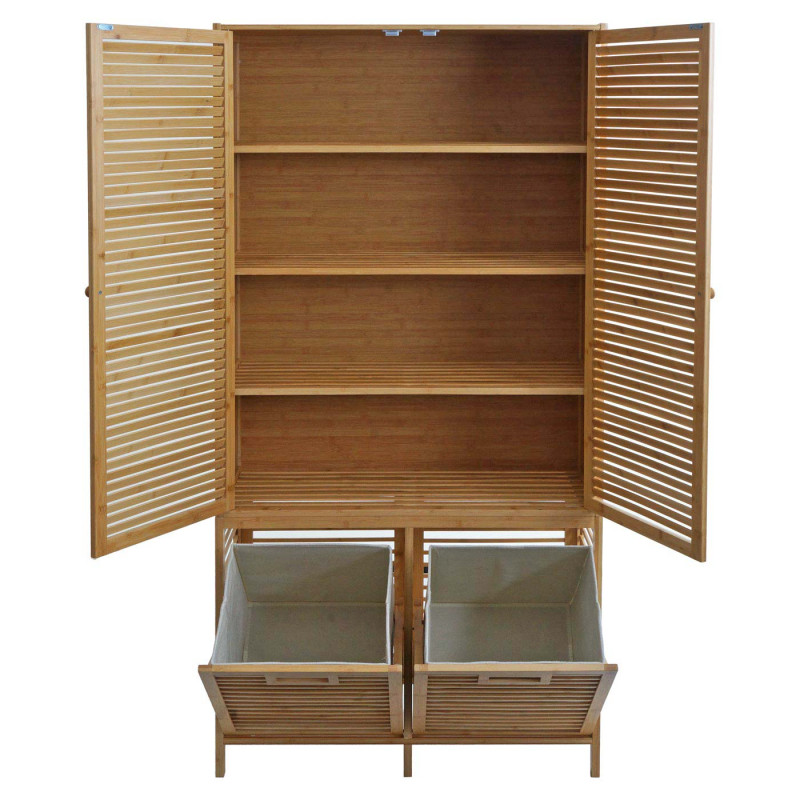 L'armoire de salle de bain N83 en bambou de haute qualité offre un espace de rangement généreux avec deux paniersàlinge et des compartiments de rangement, apportant une solution éléganteàvotre salle de bain. Les inserts en tissu amovibles permettent une flexibilité d'utilisation.
